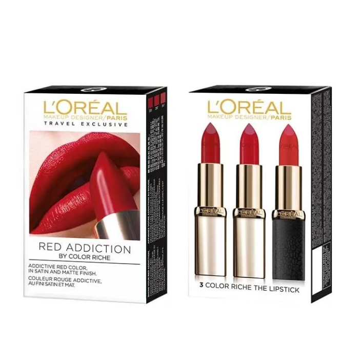 Show your red addiction. Discover 3 iconic red lipsticks created by L'Oréal's Color Designers. Indulge in unrivaled richness. Enjoy 2 voluptuous satin shades and 1 velvet matte selected for you. More than a lipstick, it's Color Riche.