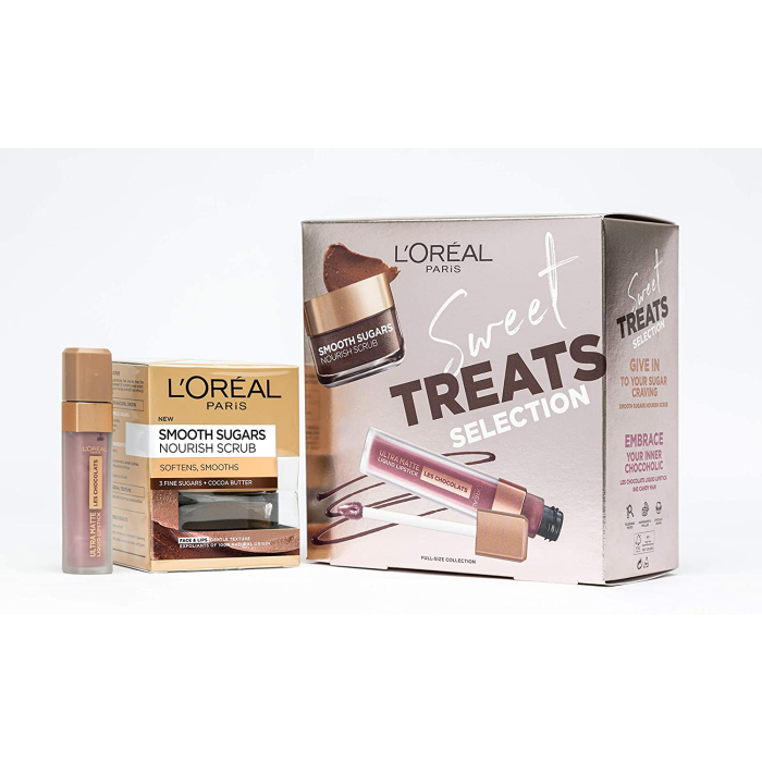 L'Oreal Sweet Treats Gift Set. This Sweet Treats selection provides a nourished and healthy glow to the face and lips, and a perfect pout. The perfect gift for a sweet-tooth beauty fan! The Smooth Sugars Nourish Scrub blends 3 fine sugars and combines them with cocoa butter to exfoliate face and lips. You are instantly left with nourished and baby-soft skin. Les Chocolats lipstick in Candy Man is an ultra matte liquid lipstick with a melt-proof formula and irresistible chocolate scent. No smudging or budging for up to 12 hours.